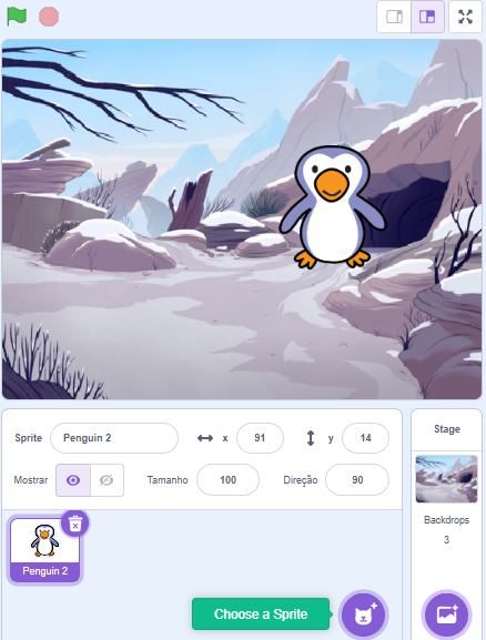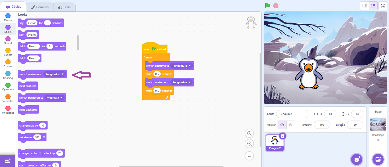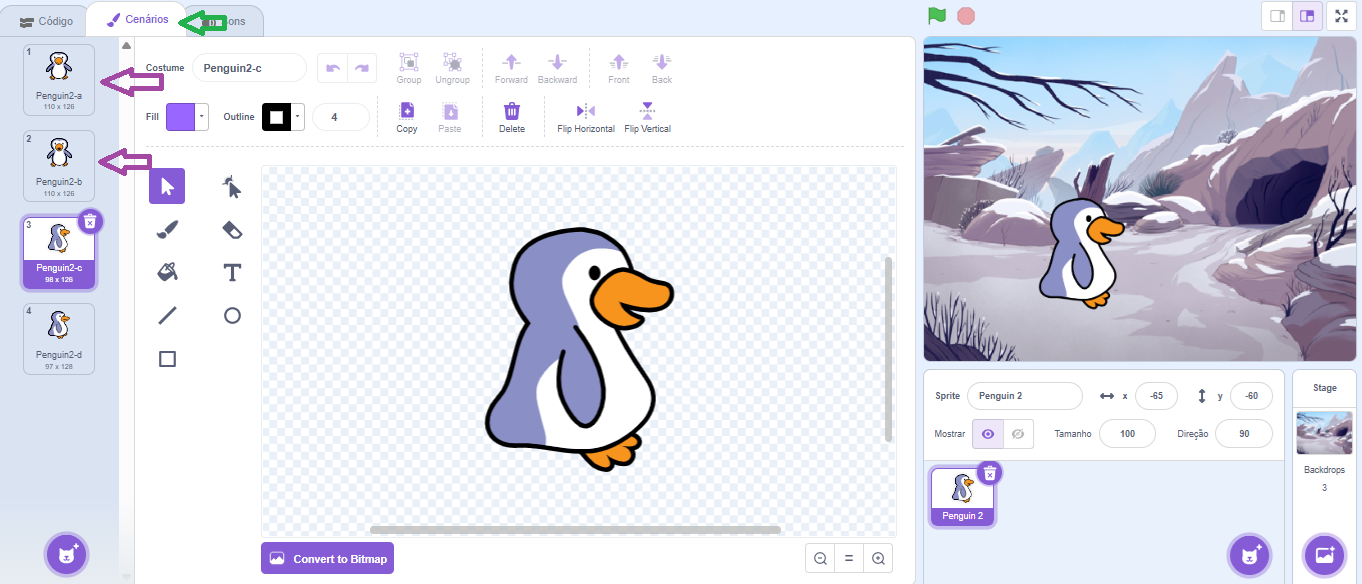 In this activity, costumes 1 (penguin2-a) and 2 (penguin2-b), indicated by the purple arrow, will be used. Delete the costumes that will not be used.