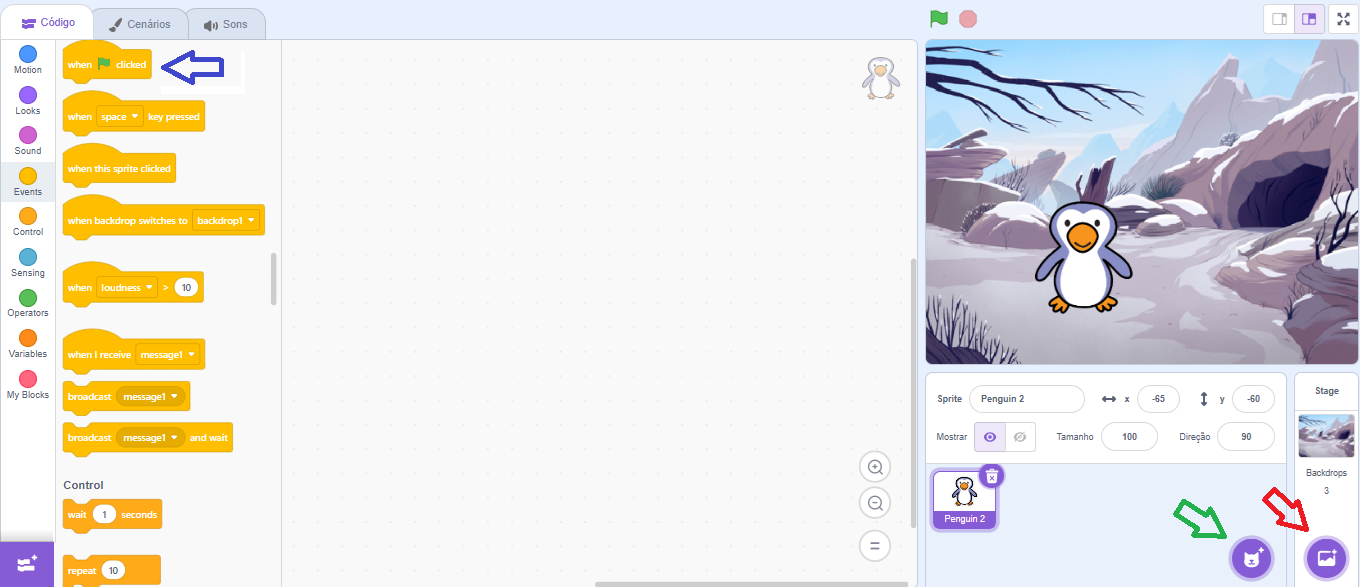 4 – List of Actors and Scenarios: It is the space where we can insert and modify the images displayed on the stage. Actors can range from characters, animals, people, objects, food, letters and numbers. Scenarios, on the other hand, are backgrounds, which can be images of real locations or artistic backgrounds, used to personalize the programming.