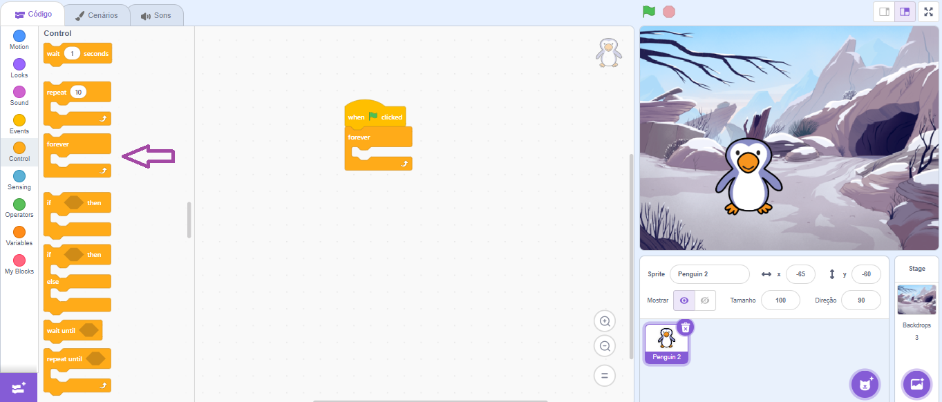 6. Select the Actor. In the code, click on “Control”, drag the “always” block to the Scripts Area (purple arrow). All new blocks should be inserted inside the “always” command.